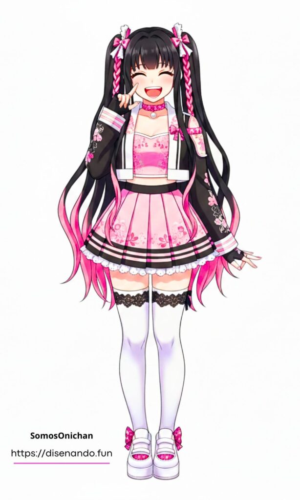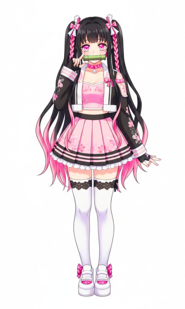 Y es que Nezuko Kamado sería la integrante más pequeña y más coquette, pues adora este estilo, combina perfecto con su cabello largo con puntas de fuego por su técnica de demonio. Así es la vestimenta de Nezuko en el universo de las guerreras K-pop: