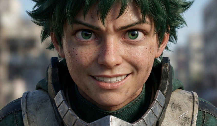 Pero lo que realmente eriza la piel son sus rasgos faciales. La imagen respeta sus características pecas y esos grandes ojos verdes, pero les dota de una mirada llena de determinación y madurez. Ya no vemos solo al estudiante de la UA, sino al héroe que carga con el peso del One For All(que ya no tiene del todo) sobre sus hombros.