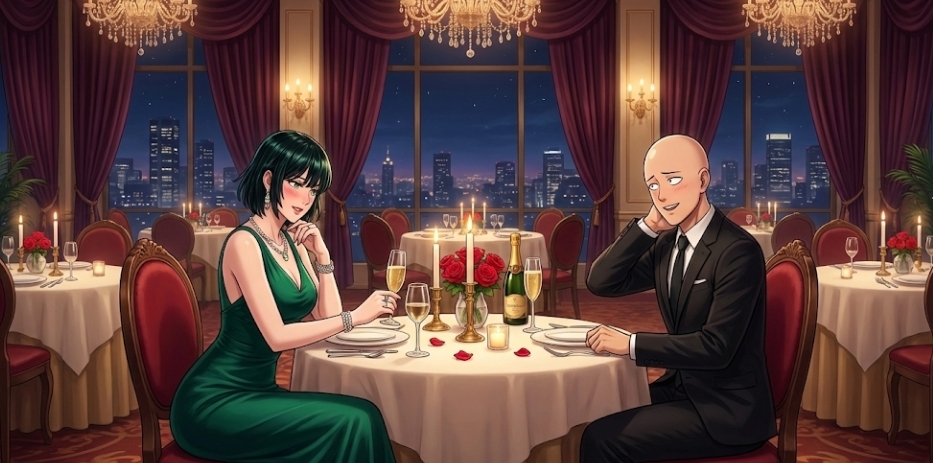 Se encuentran en un restaurante de lujo solo para ellos dos, bajo una noche hermosa, digna de dicha propuesta, Saitama se ve caballeroso desde el principio, tomando la silla para que Fubuki se siente, Fubuki logra tener una conversación muy buena con Saitama al presentarle nuevos villanos poderosos, al ser un afan por parte de Saitama para encontrar un oponente digno, este se interesa mucho.