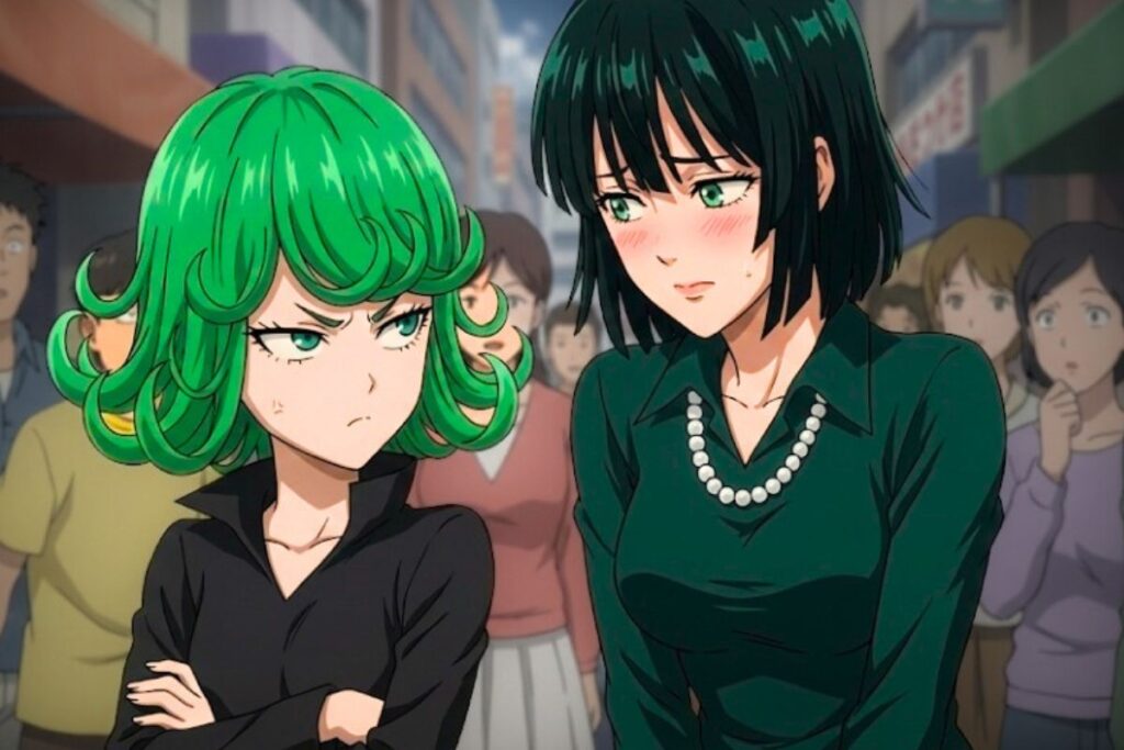 Tatsumaki cambia su vestimenta caracteristica con su hermana Fubuki en este interesante interpretación por parte de nuestro diseñador estrellacreativo en instagram y seo en SomosOnichan.